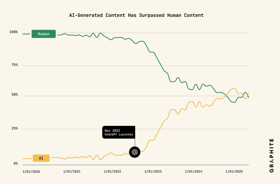 In November 2024, the quantity of AI-generated articles being published on the web surpassed the quantity of human-written articles. However these articles are largely absent from Google and ChatGPT.
